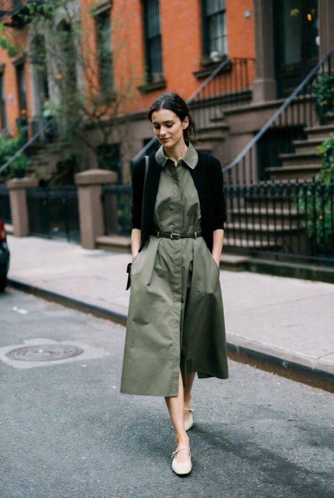 Finish with black leather ballet flats and a small structured bag. Simple, practical, and exactly right for a full day in the city.
