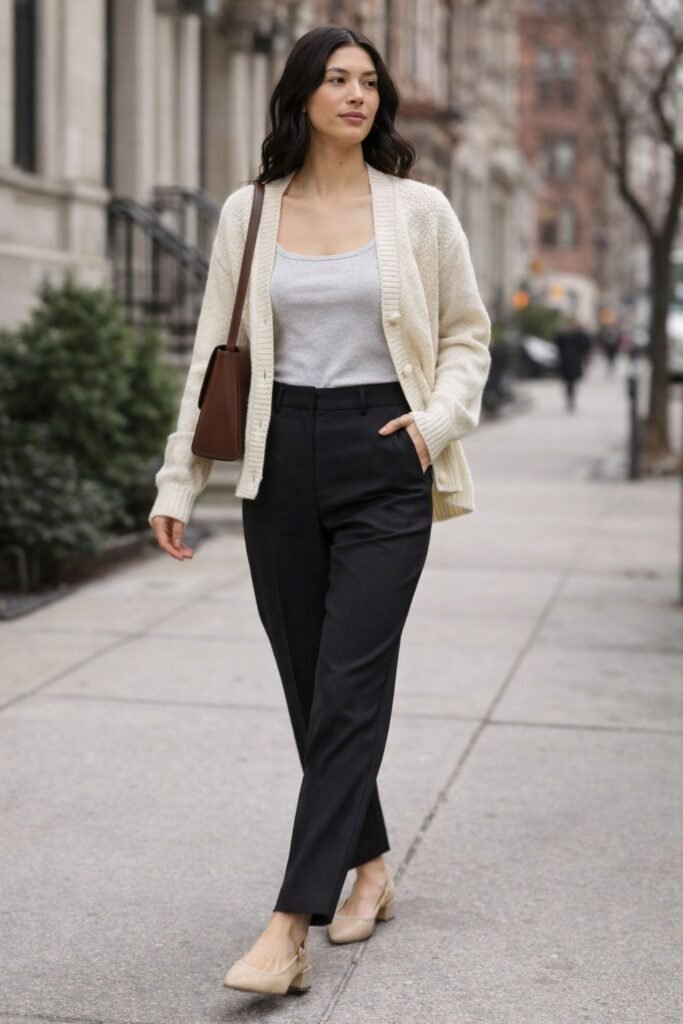 For the bottom, go with tailored trousers. Something mid-rise with a clean front that holds its shape. This is what keeps the outfit from slipping into “too casual.” The contrast between the soft top and structured trousers is what makes it work.
