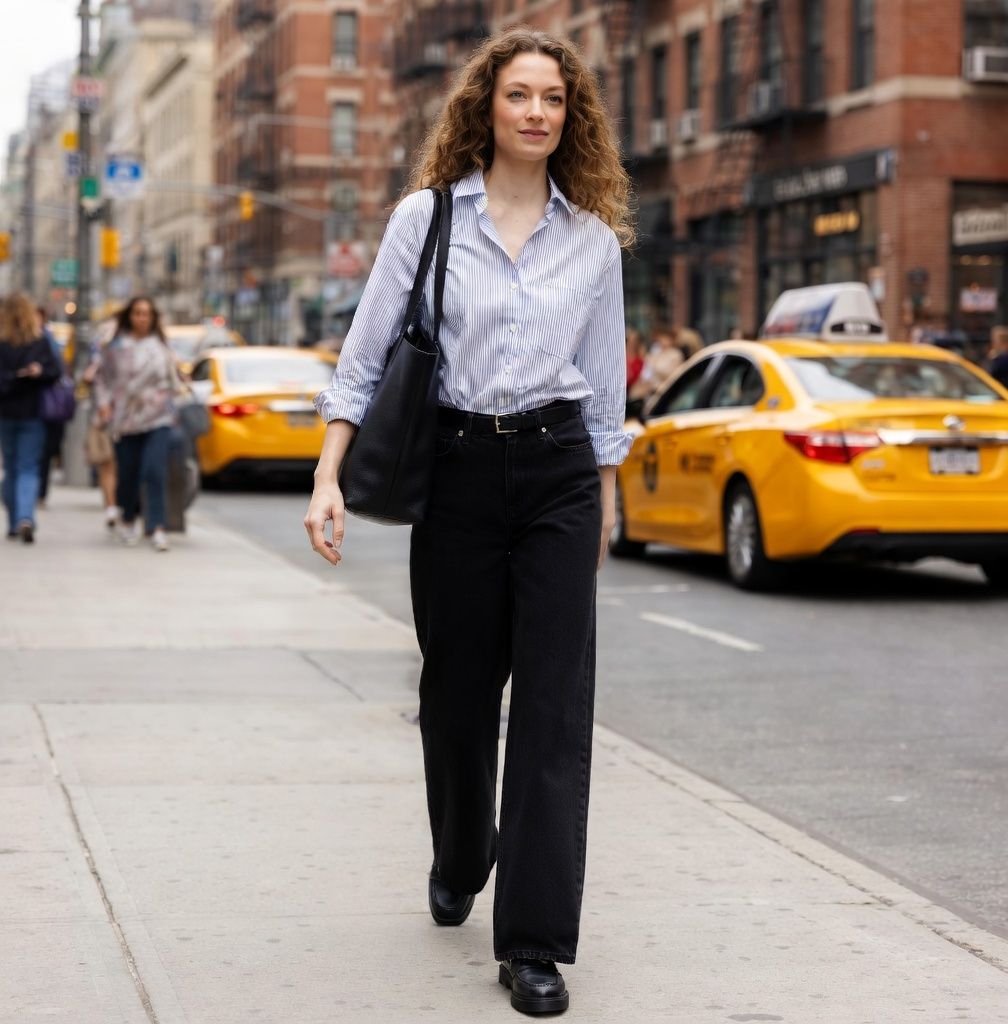 Finish with loafers for a slightly more polished feel, or pointed slingback if you want something lighter. Add a thin leather belt to define the waist and a structured tote to pull everything together.