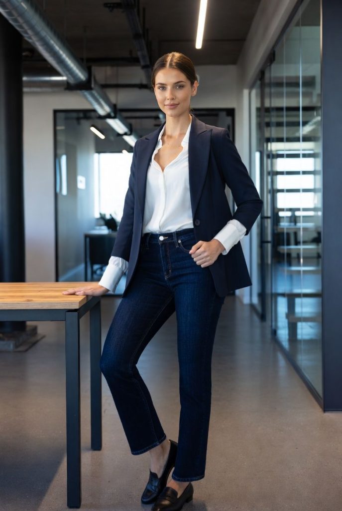 Yes — dark wash or straight-leg, paired with structured tops/blazers. - How to dress professionally in unpredictable weather?